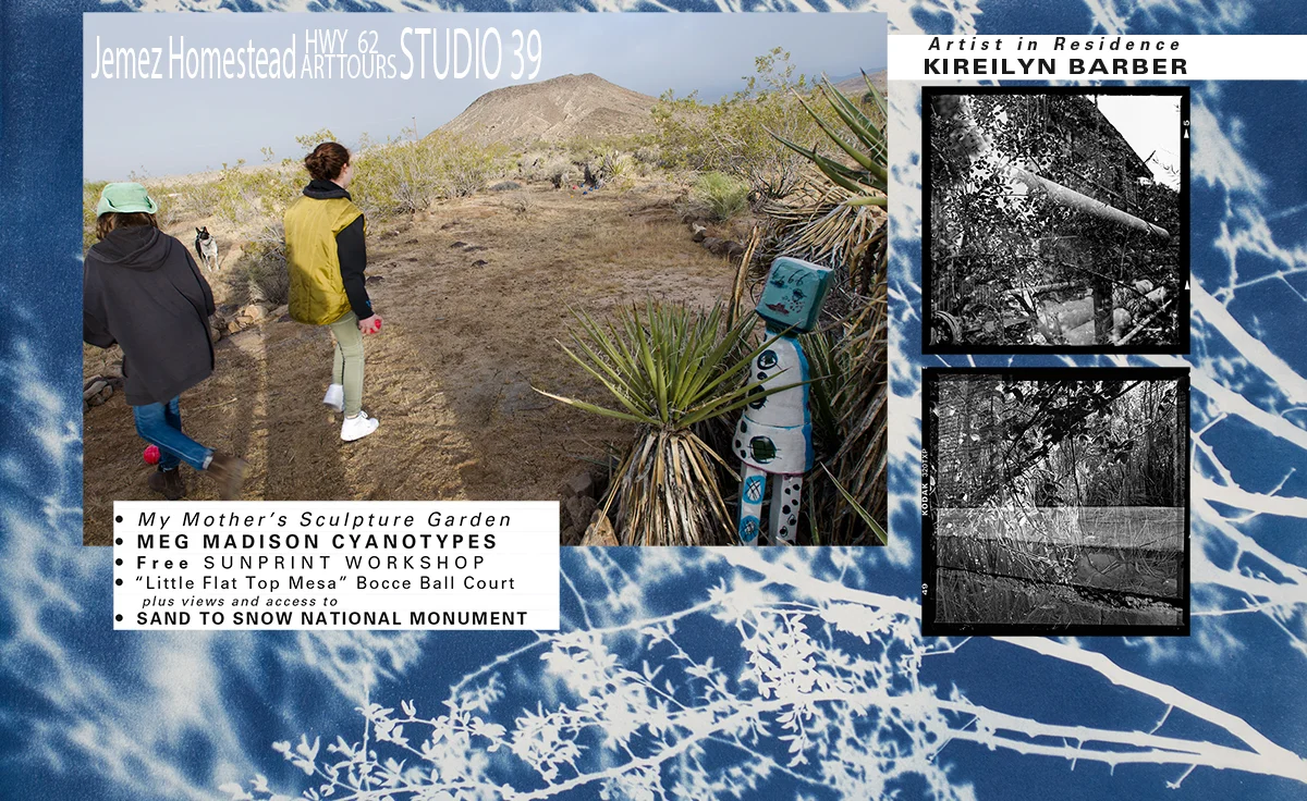 Madison is showing cyanotypes, brilliant blue photograms, of all the desert plants on the 5 acre JEMEZ HOMESTEAD property. She also has made cyanotypes of other desert items, like guns, and fences, and rocks and sand.